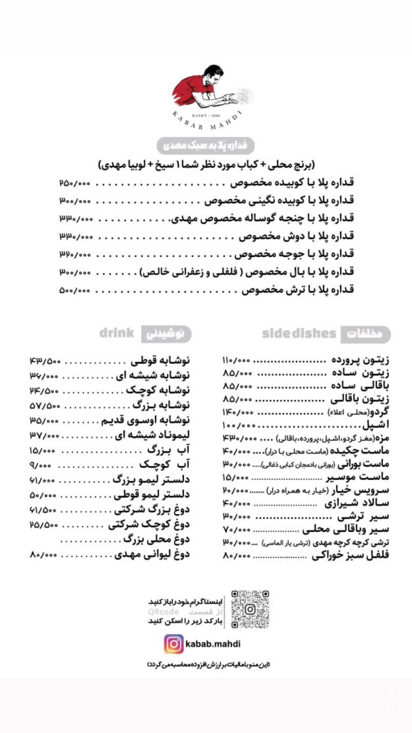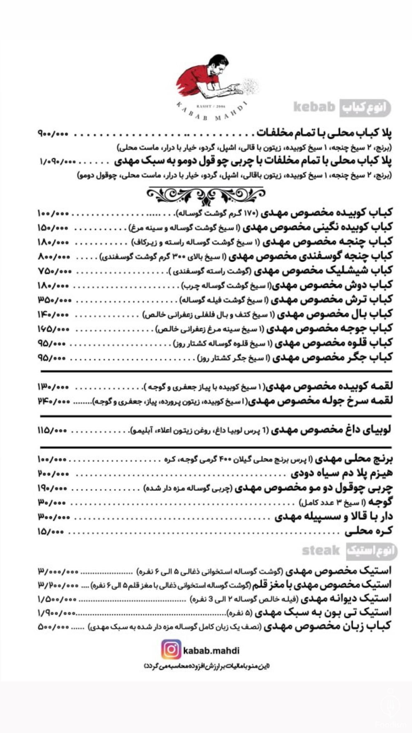 کبابی مهدی یکی از شلوغ ترین کبابیهای شهر رشت است که ابتدا در منظریه فعالیت میکرد و بعدها به محل فعلیاش منتقل شد. این رستوران با ویدیوهای جذاب آشپزی شبیه به «نصرت» در اینستاگرام به شهرت رسید و حالا بهعنوان یکی از پرمخاطبترین رستورانهای گیلان شناخته میشود. فضای کبابی مهدی ساده و سنتی است اما همیشه شلوغ و پرانرژی، مخصوصاً در روزهای تعطیل.