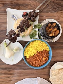 The menu features a variety of Iranian and Gilaki kebabs — from Chenjeh and Koobideh to Sour Kebab and grilled liver. Local sides like marinated olives and traditional Doogh complete the meal. While the kebabs are often delicious, some guests note inconsistency in quality between visits.